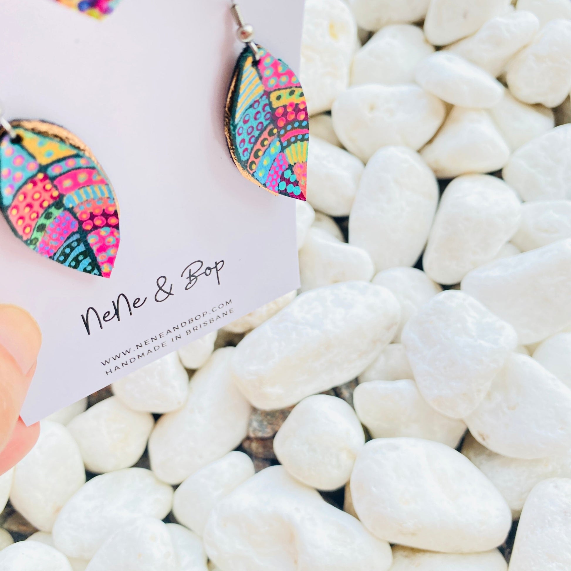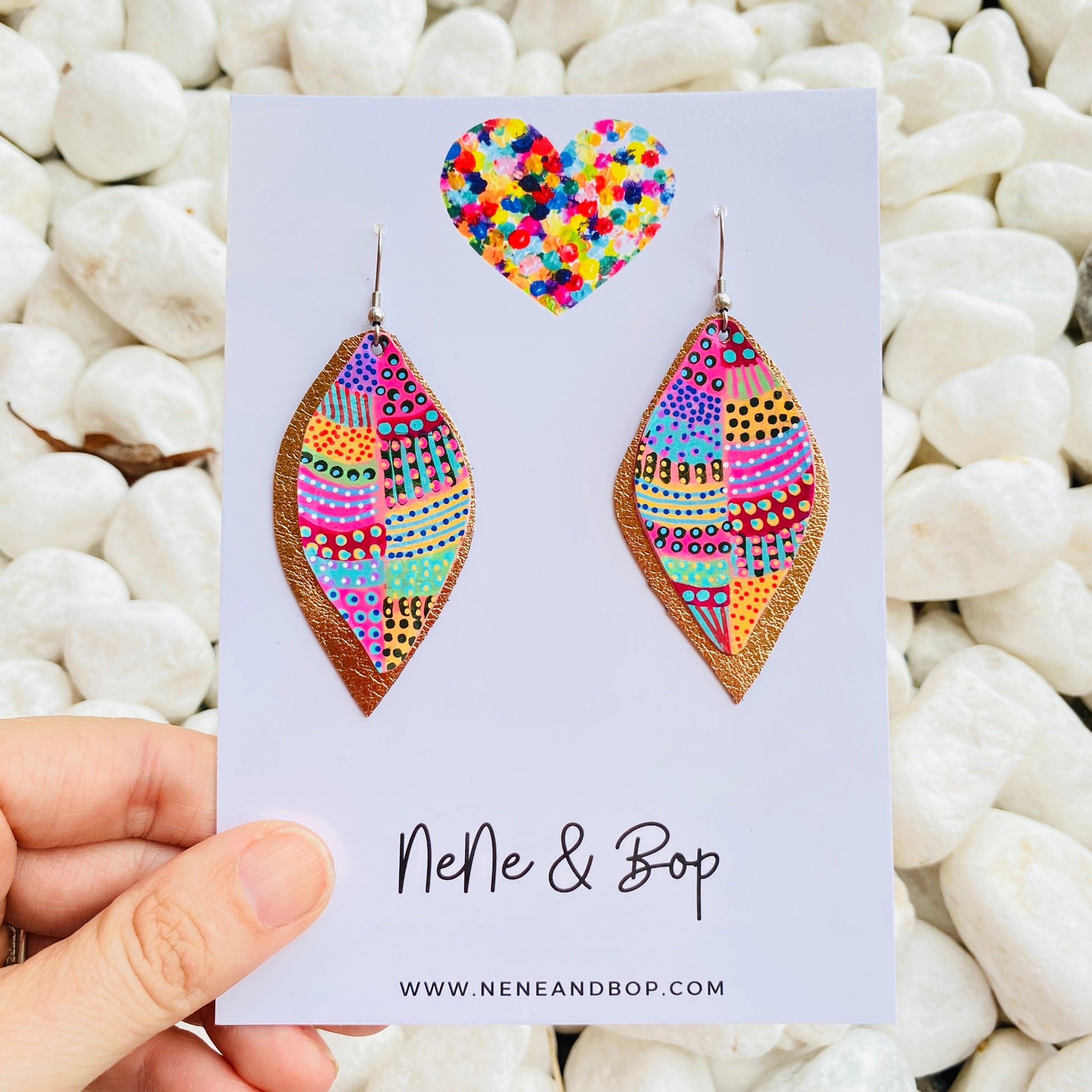 Hand cut, layered with Rose Gold leather and hand painted minute details, these earrings have been created from leather remnants remaining after bag are construction.