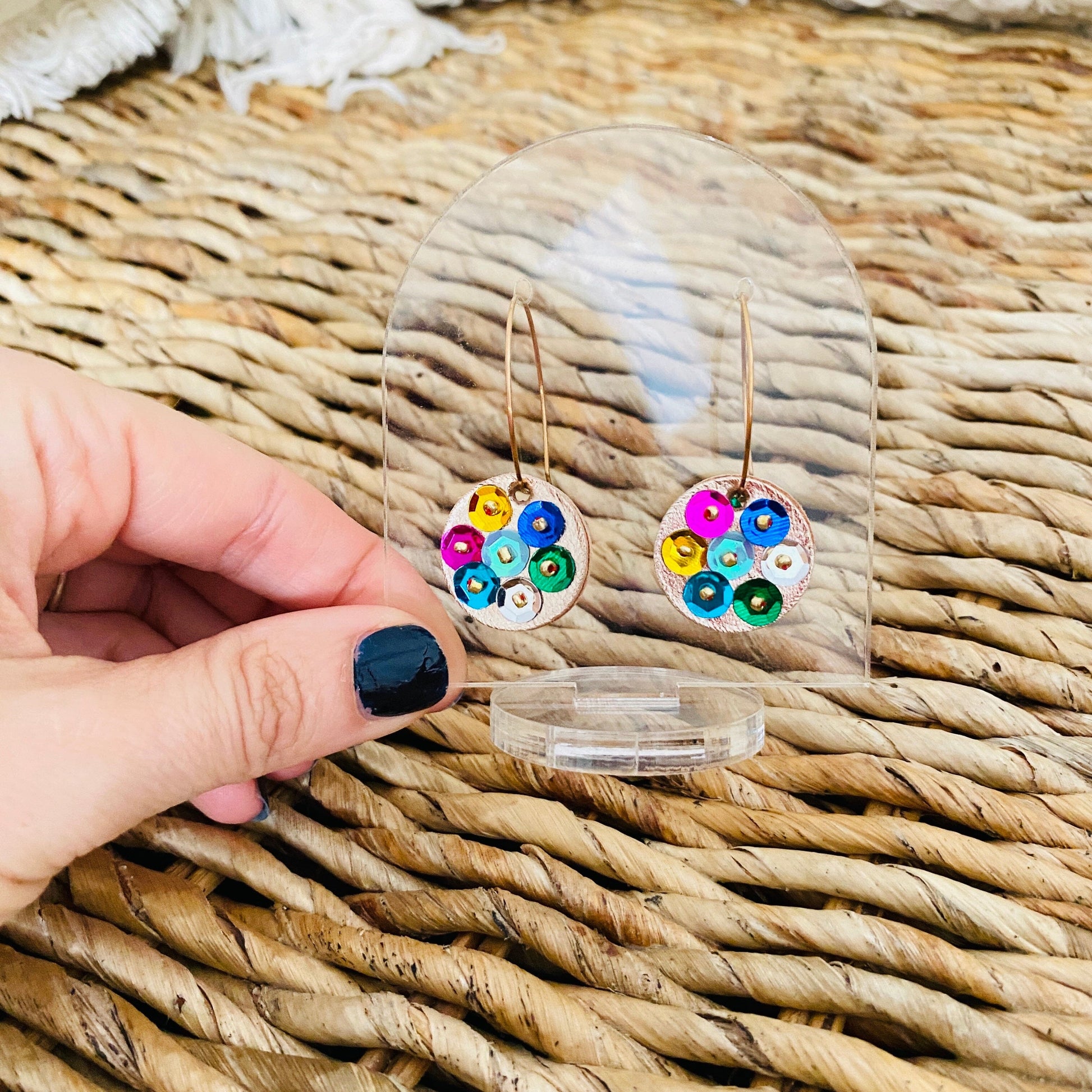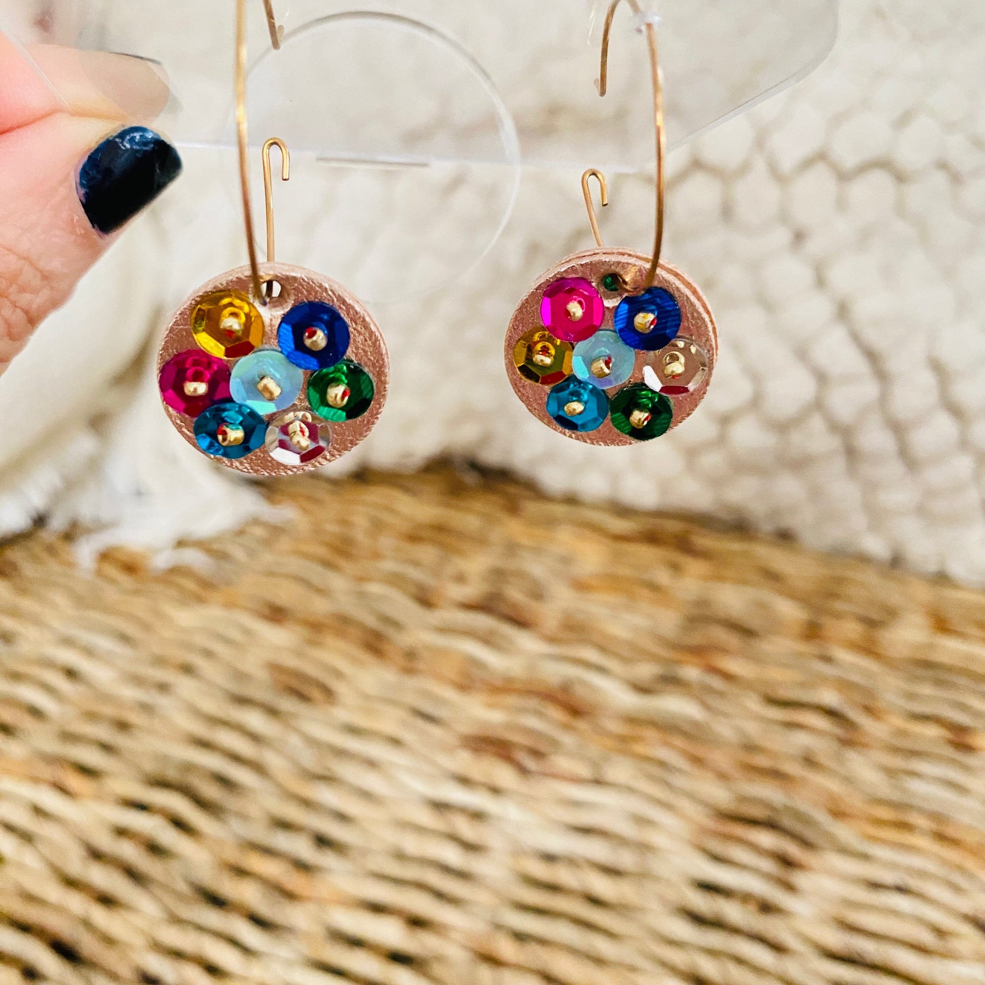 Hand stitched beads and sequins on a rose gold leather base minute details, this collection of earrings has been inspired and created from leather remnants remaining after my bags are constructed.
