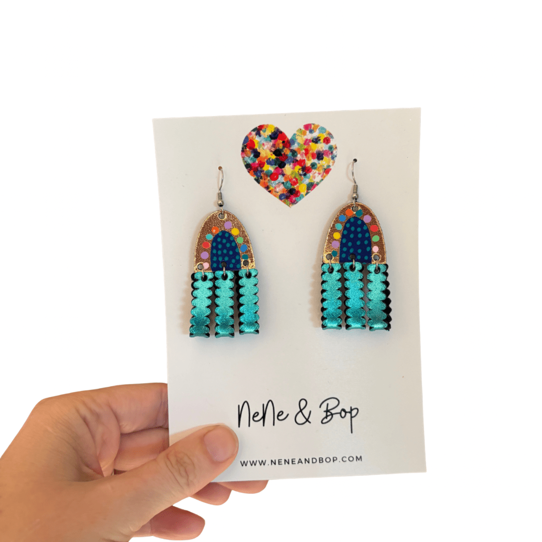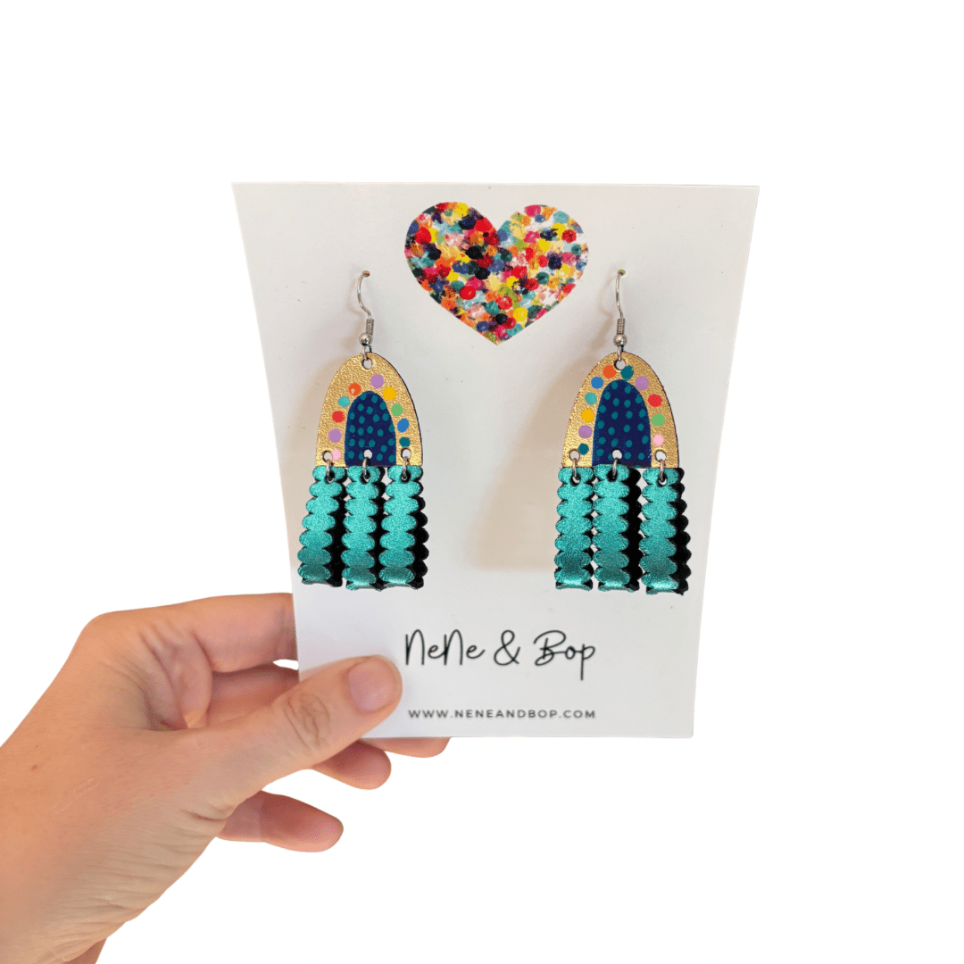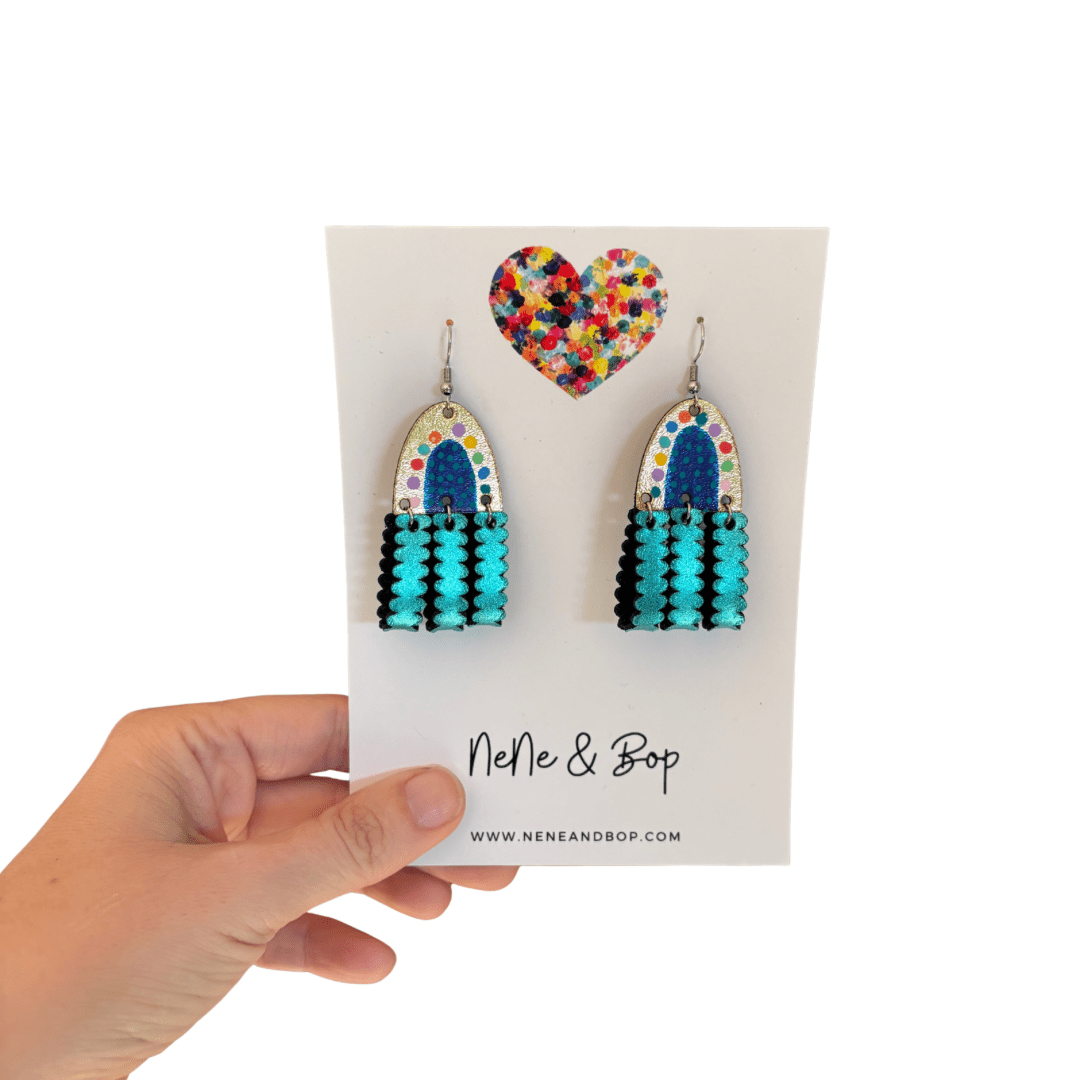 Hand painted with pearlescent paint and minute details, this collection of earrings has been inspired and created from leather off cuts that would have previously been discarded.