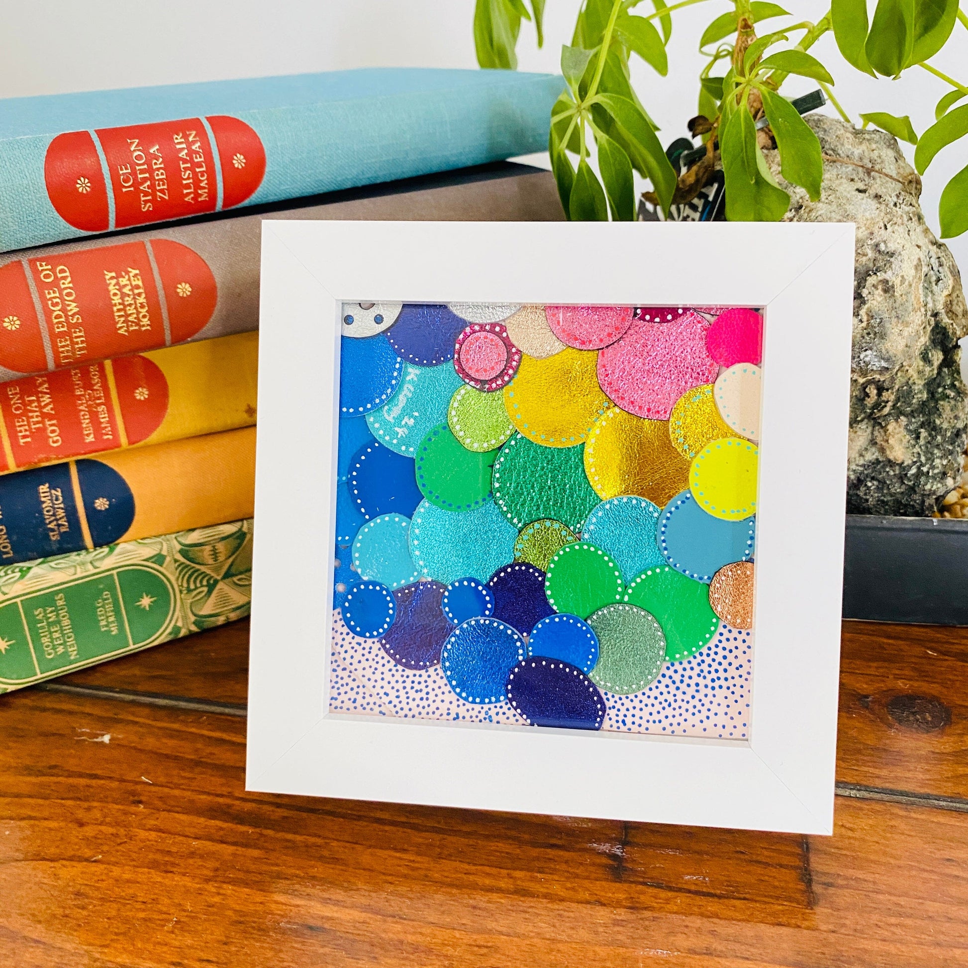 Leather collage - Box Frame - Rainbow Circles