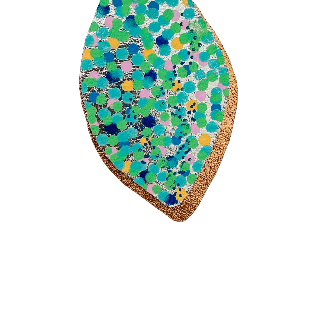 Hand cut, layered with Rose Gold leather and hand painted minute details, these earrings have been created from leather remnants remaining after bag are construction.